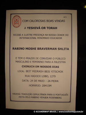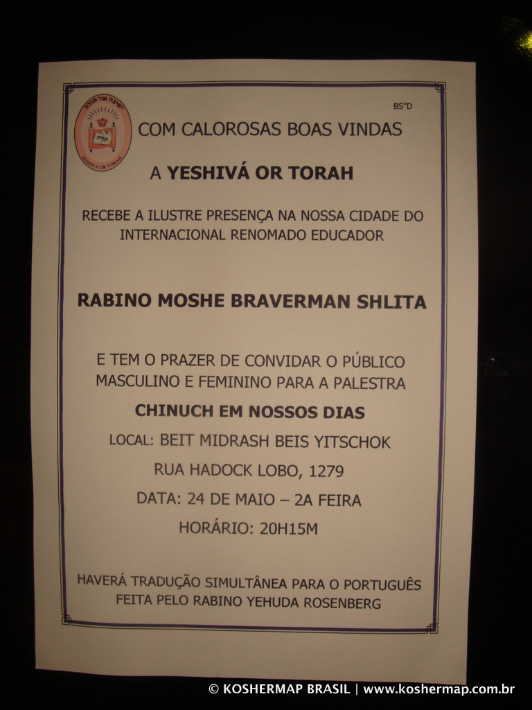 A Yeshivá Or Torah, sob liderança do Rabino Meir Avraham Iliovits Shlita, convida o público da Comunidade Judaica de S. Paulo, homens e mulheres, para o grande evento educacional e palestra internacional com o Renomado Rabino Moshe Braverman Shlita de Israel. O tema da palestra será " CHINUCH EM NOSSOS DIAS" Segunda, 24/05/2010 `as 20:15hs no BEIT MIDRASH BEIS YITSCHOK `a Rua Hadock Lobo, 1279. Tradução simultânea para o portugês com o renomado Rabino Yehuda Rosenberg da Yeshivá Or Israel de Cotia.