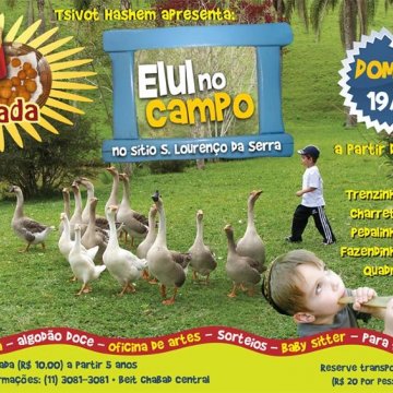 Neste chodesh Elul 5772 aproveite a estrutura do Sítio, além de artes, entretenimento, buffet de saladas, batata frita e um deliciosa falafada. Entrada: R$ 10 a partir de 5 anos. Transporte R$ 20 mediante reserva prévia.