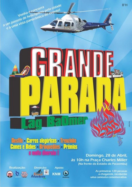 Mais uma vez, a Yeshivá e as Escolas Lubavitch e Gani preparam uma Incrível Parada de Lag Baomer, com desfile, carros alegóricos, trenzinho, comes e bebes, brinquedos, prêmios e sorteio de passeio de helicóptero!