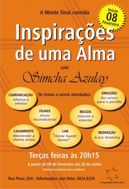 Workshop " Inspirações de uma Alma " com Simcha Azulay. São 7 temas exclusivos para mulheres da Comunidade Judaica na Congregação Monte Sinai.