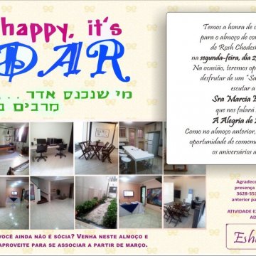 ESHET CHAIL - Atividade especial de Chodesh Adar com palestra de Márcia Eliezer sobre "A Alegria de Adar", Salad Bar, Comemoração dos Aniversariantes do mês e recepção das novas sócias.