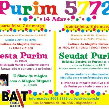 O BAIT convida a Comunidade para sua Festa de Purim, com direito a Leituras da Maguilá, Show de Mágica, Sorteio de Prêmios, Cachorro-quente e Mishloach Manot, em 07 de Março. No dia seguinte, além de várias leituras da Meguilá, uma Super Seudat Purim com os Rabinos da Sinagoga.