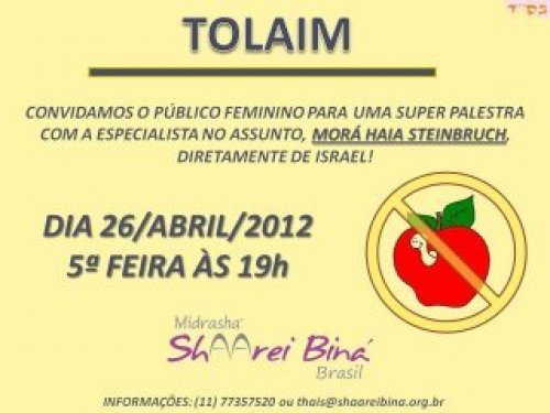 A Midrashá Shaarei Bina Brasil convida o Público Feminino para uma super palestra sobre Tolaim com a especialista Haya Steinbruch, autora do livro "A Verificação de Alimentos Segundo a Torá".