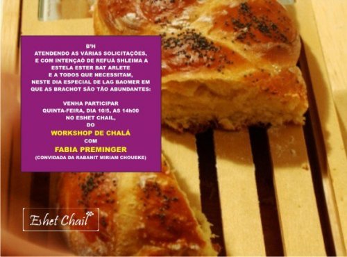 O Centro Eshet Chail promove um Workshop de Chalá com Fabia Preminger neste dia propício de Lag Baomer. Dedicado em Refuá Shlemá para Ester Stela bat Arlete e para todos os que necessitam.