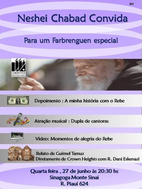 O Grupo Neshei Chabad convida o Público Feminino para um Farbrenguen especial em alusão a Guimel Tamuz, com Depoimento, Atração Musical, Vídeo e Relato de Guimel Tamuz 5772 - 2012.