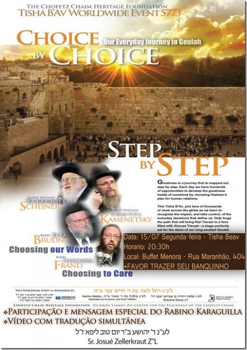 Como em todos os anos, e que este nem chegue a ser o último, haverá a transmissão no Buffet Menorá do vídeo "Tishá B'Av 5773 - Choice by Choice, Our Everiday Journey to Geulah", da Chofetz Chaim Heritage Center, com tradução simultânea e mensagem especial do Rabino Karaguilla.