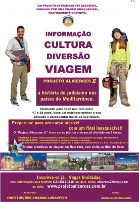 Realizado por Instituições Chabad Lubavitch do Brasil e apoio do Keren Nehor Menchem. Inscrições com vagas limitadas através do telefone (11) 3811-1318 ou alicerces.2@gmail.com - www.projetoalicerces.com.br