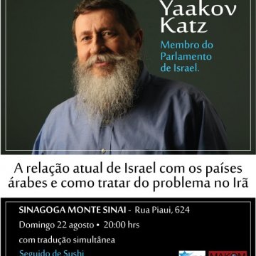 Yaakov Dov Katz, conhecido por muitos como Ketzale, parlamentar e empresário proprietário do site de notícias Arutz 7, foi o convidado especial para o mega-evento Palestra & Sushi, e abordou o tema: A relação atual de Israel com os Países árabes e como tratar do problema no Irã.