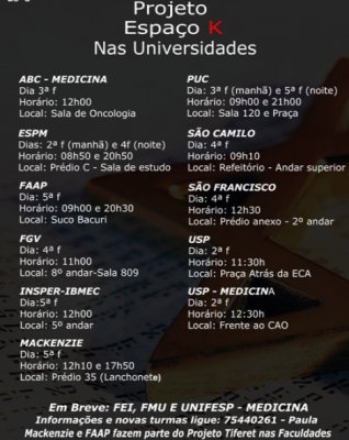 Entre as universidades atualmente atendidas estão ABC - MEDICINA, ESPM, FAAP, FGV, INSPER - IBMEC, MACKENZIE, PUC, SÃO CAMILO, SÃO FRANCISCO, USP e USP - MEDICINA.